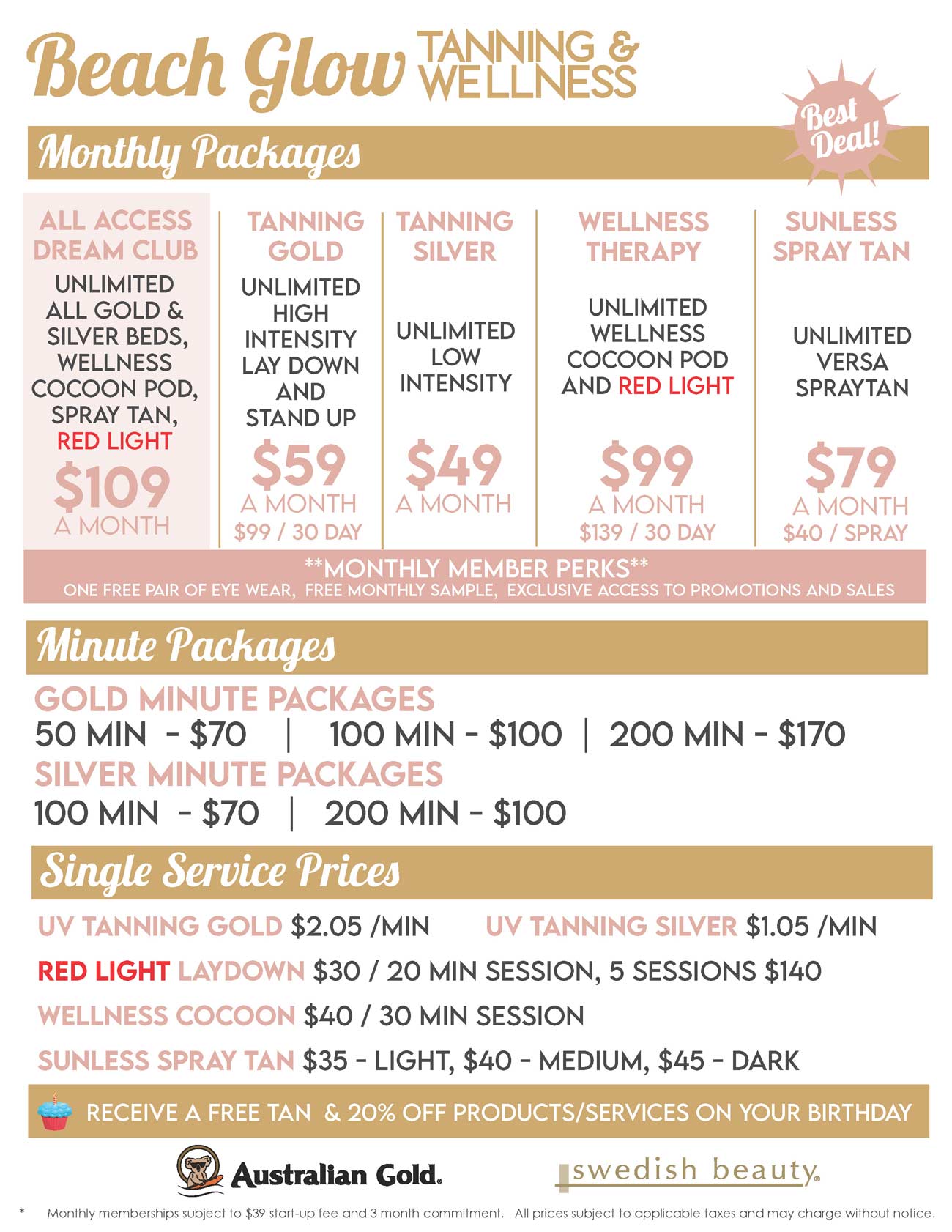 Our best deal! Become a Dream Club VIP Member to enjoy full unlimited access to all UV tanning, versa spray tan, cocoon pod, and red light therapy bed. Plus receive a complimentary lotion sample each month, free pair of eye wear, exclusive access to sales and promos. This package provides you with the total experience! For more details and to sign-up please ask our Salon Staff during your next visit.